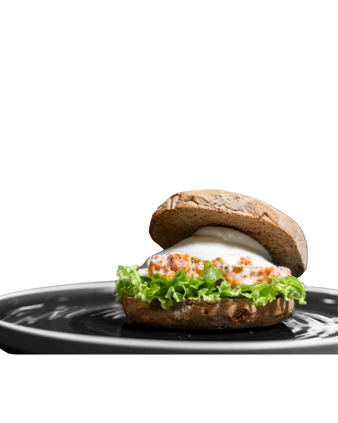 Uma criação leve e sofisticada: salmão fresco com cebolinho, mozzarela cremosa e maionese de alho, servido em bolo do caco de alfarroba com rúcula e alface. Um sabor elegante, fresco e irresistível.